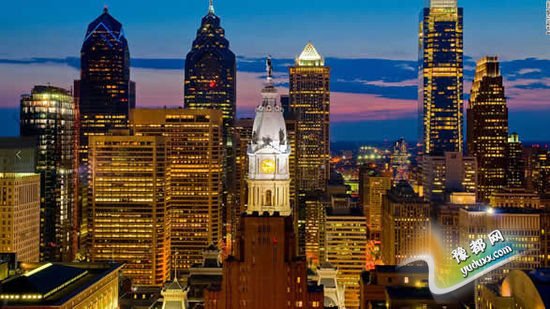 费城市政厅钟楼建于1901年,高167米,由总设计师约翰?麦克阿瑟设计完成。乘坐一个很小的电梯,就可以到达大楼观景台,游客可以看到塔楼内部的运作、楼顶的四个大钟以及俯瞰大楼四周的景色。该钟楼的特色是在楼顶是宾夕法尼亚州费城的创始人威廉?佩恩的铜像,在威廉?佩恩铜像的周围是四个较小的青铜雕像,这些铜像代表着费城的第一批居住者,他们都是瑞典移民和美国原著民。