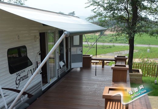 房车小镇的50辆美产拖挂式房车便零星散落在绿地间,房车既有单独安置的,也有带院子的,院子里有种植区,可以养花种菜,有遮阳伞和木质桌椅,可以打牌聊天BBQ,十分安逸。