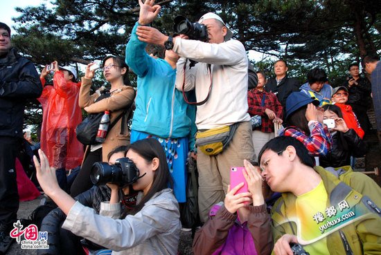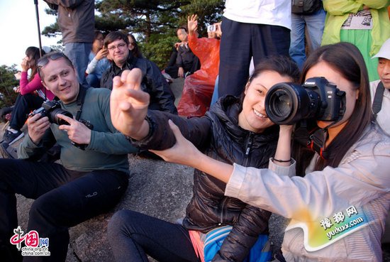 当天日落时分,丹霞峰上早已坐满了观赏日落的游客。有一来自上海的小朋友和父母早早就赶到了丹霞峰顶,见太阳迟迟不肯下山,就有些不耐烦了,对着太阳说,“给你一分种的时间,再不下山的话,我就惩罚你了”。这时,只见太阳一点点落下,在九龙峰的衬托下分外妖娆壮观,一些游客摆出用手托住太阳的姿势,让同伴为其拍照。更多的游客,对着落日不停拍照。(文/图 王辉)