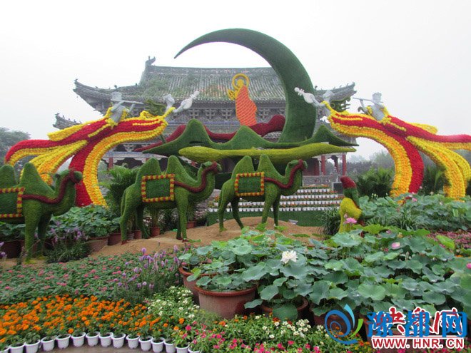 铁塔景区接引殿前广场,一组荷花景观吸引众多游客围观。挤进人群中看到:以玄奘西行、身姿曼妙的彩衣妙音飞天为背景,满载货物的驼队及客商从远方缓缓驶来,仿若打开一幅历史的画卷,重现来玄奘取经,和平祥音,飞天起舞,客商云集,展现东西方文化交流的悠久的历史和传承,前方点缀植物和各色菊花,构成悠然自在的人间仙境,再现佛文化及茶文化之辉煌历史。据正在忙碌的铁塔景区主任刘荣说,这组荷花景观名字为:驼铃丝茶路 传承之旅,只是景区内荷花景观普通一景。
