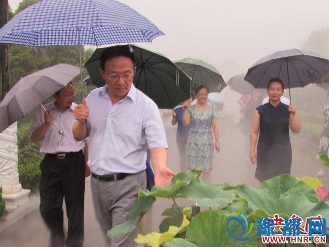 开封市委常委、宣传部部长王载飞与市民冒雨游园赏荷。