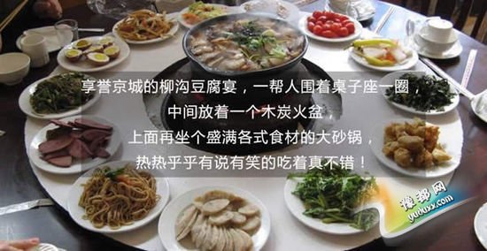 柳沟的火盆锅豆腐宴由传统习俗演变而来,因烹制方式和口味的特别,加上纯朴风格的乡村宴会式服务,名播京城,声誉远远盖过古城遗址。来到这里,每人都要品尝一下这里远近闻名的“火盆锅、豆腐宴”。作为延庆县火盆锅的发祥地,柳沟村结合古城资源和新开发的三色豆腐:美容养颜的黄豆豆腐、滋补养肾的黑豆豆腐、清热袪火的绿豆豆腐,创出“凤凰城–火盆锅–农家三色豆腐宴”品牌。